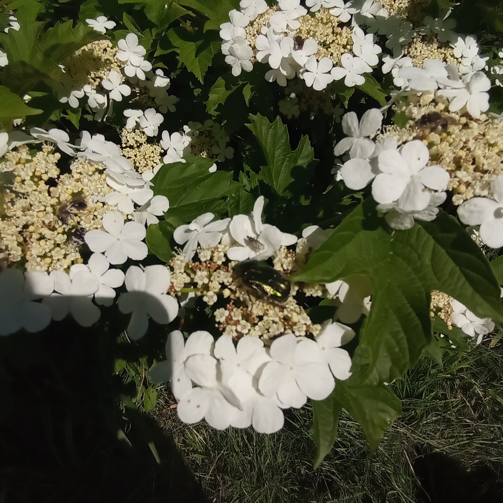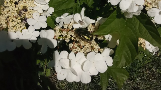 Nous retrouvons sur l’extérieur les mêmes grands pétales blancs mais d’est au centre que nous trouvons de multiples insectes pour une très bonne raison : c’est là que sont les vrais fleurs. En effet, le viorne qui produit des toutes petites fleurs à développer en périphérie de celles-ci de grandes fausses fleurs pour attirer l’œil des insectes.