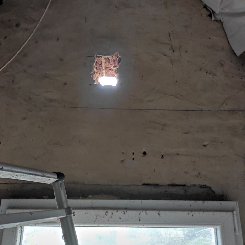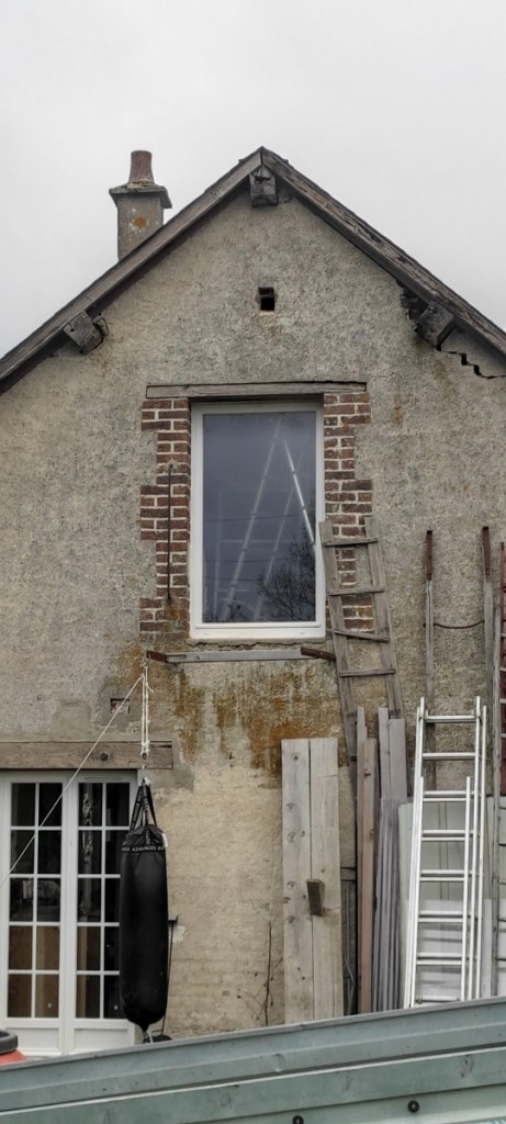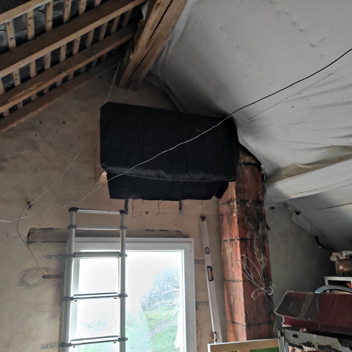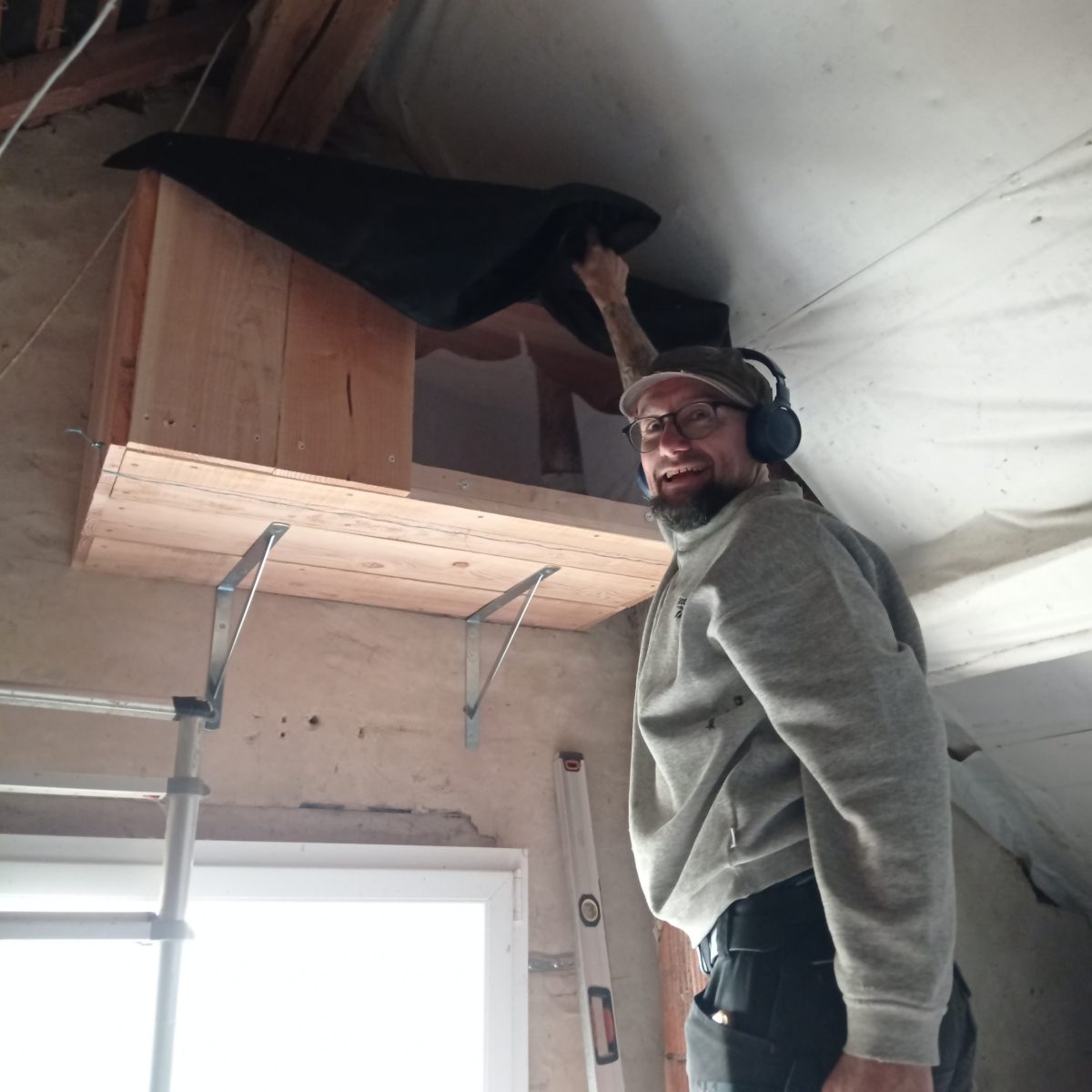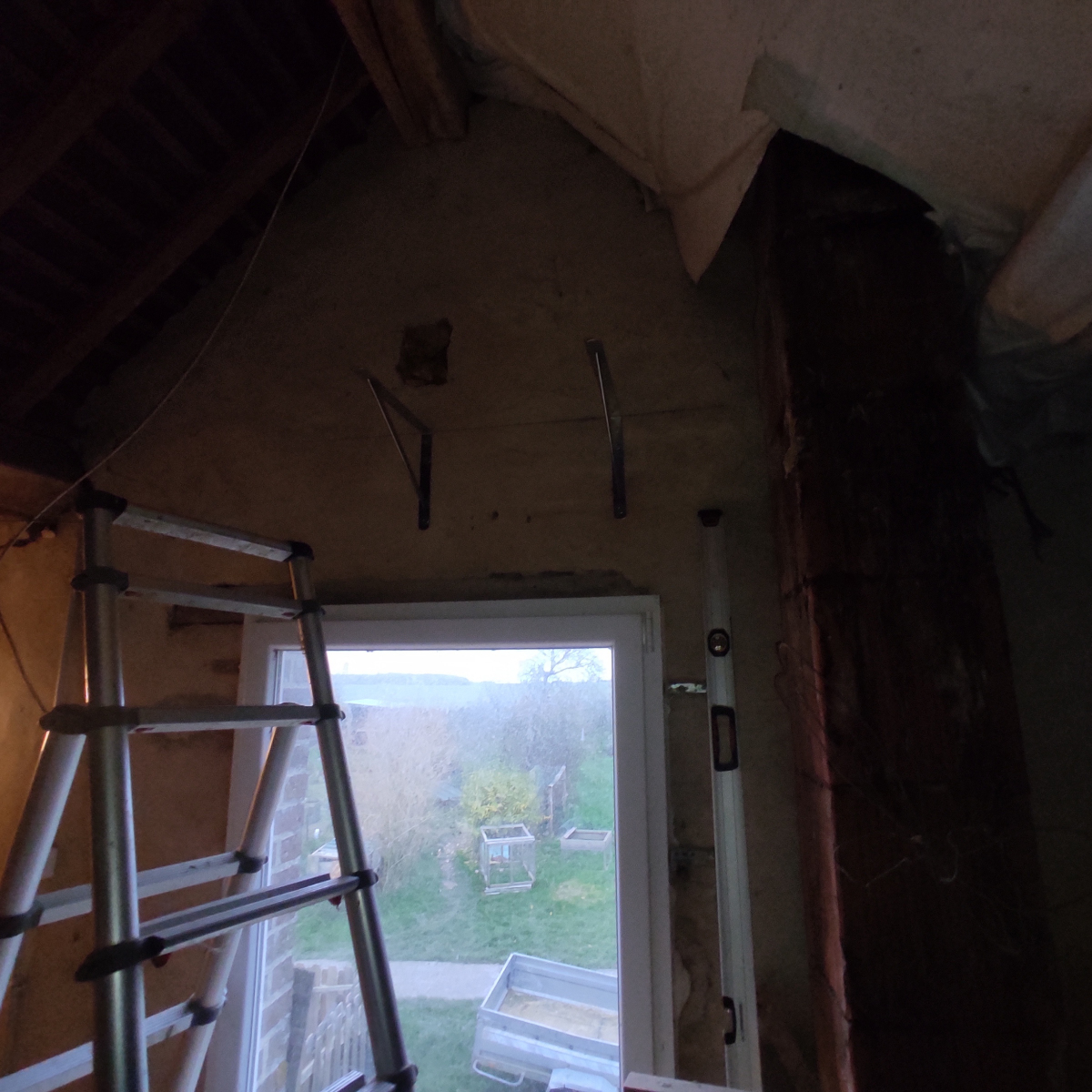 Ensuite, les supports ont été fixés au mur, la cabane démontée, montée au grenier, montée sur les supports puis remontée une fois en place (vous suivez ?)