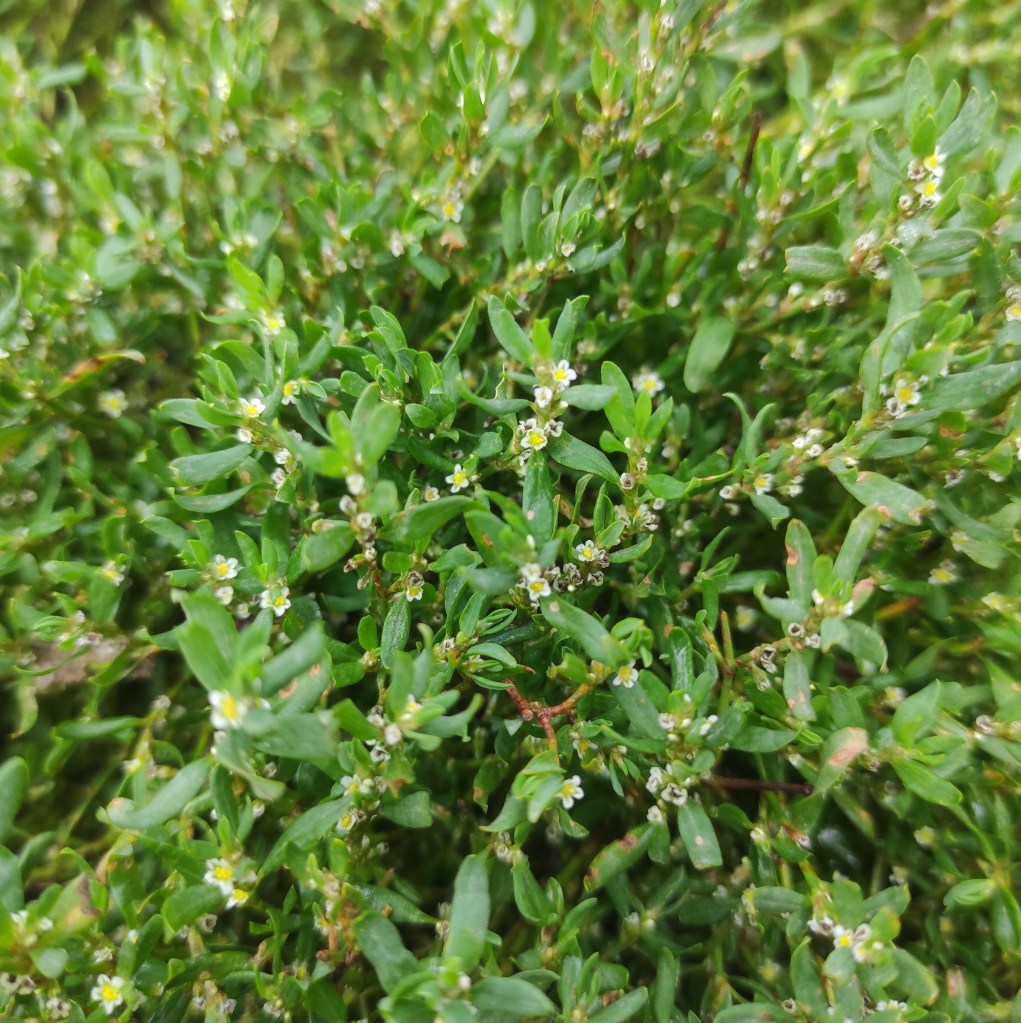 La présence des poulets et les passages répétés ont fait disparaitre l’herbe d’une grande partie du parc du poirier. Elle a été remplacée par une petite plante rampante. Par curiosité, j’ai fait une identification : c’est la renouée des oiseaux (Polygonum aviculare).