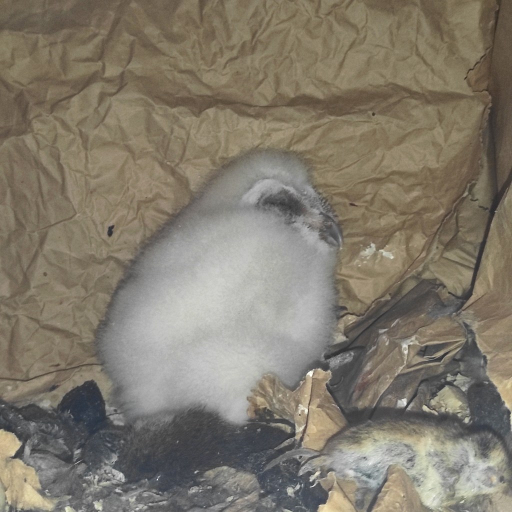 Des nouvelles de la star de l’année : l’Effraie des clochers qui niche chez nous. Il y a eu 5 œufs de pondus, 2 ont éclos et un petit est en train de bien grandir (il a de quoi manger !)