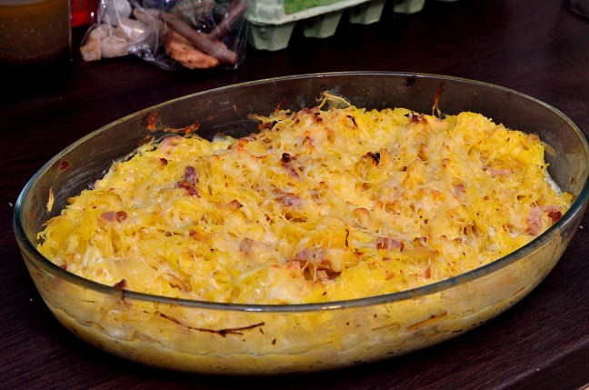 • Dans un plat, gratter la courge à la fourchette pour détacher ses spaghettis puis ajouter le mélange oignons et lardons.