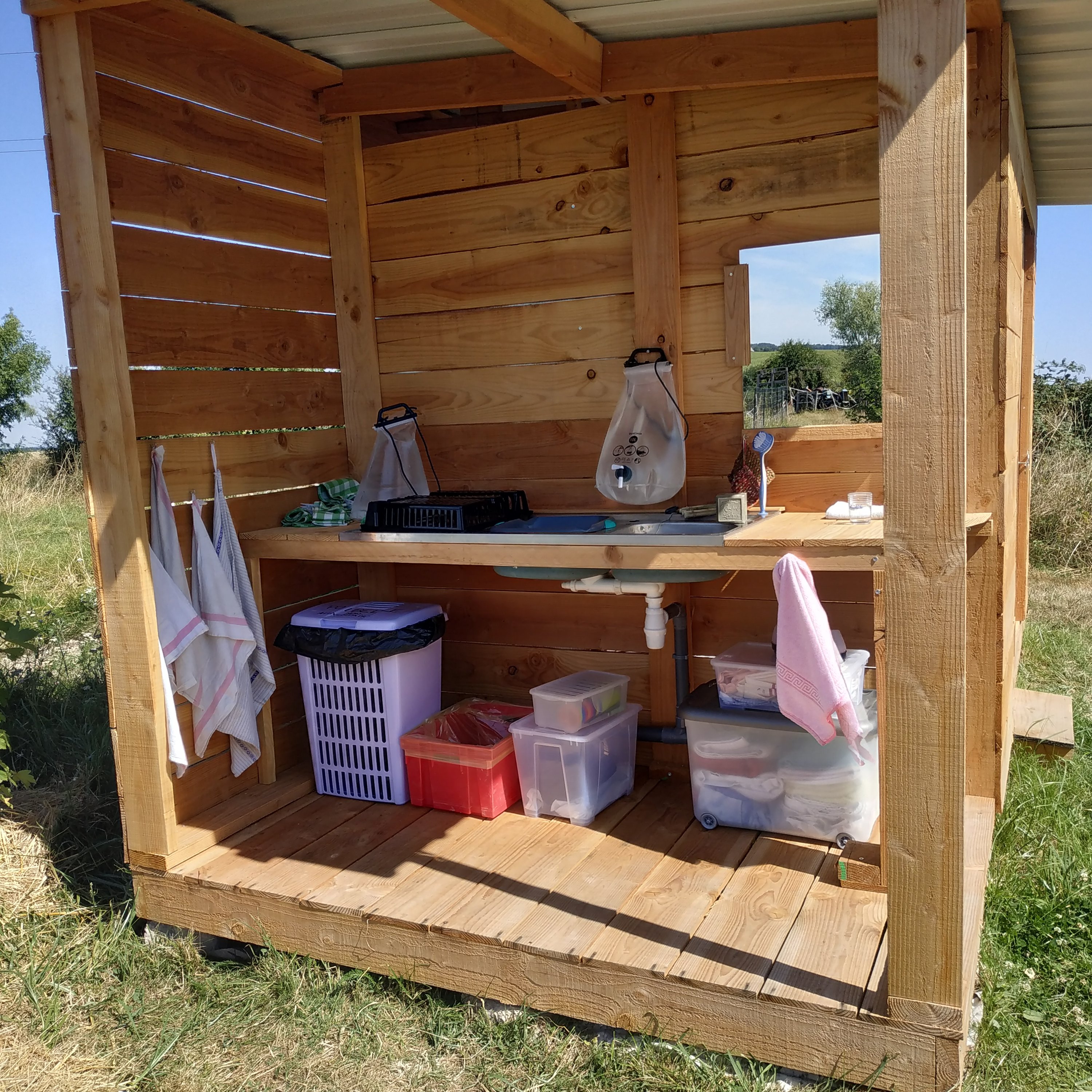 Nous mettons à votre disposition tentes, tapis de sols, duvets, draps, lampes, gourdes et tout le matériel nécessaire pour vous installer dans une zone tranquille proche de notre bloc sanit’air. Celui-ci comporte une cabine de douche pour y suspendre les poches de douches solaires, un toilette sèche et un lavabo avec jerrycan pour la vaisselle, le lavage des mains et des dents. Dépaysement assuré !!!